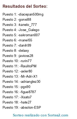 Lista de participantes: -Jose_Galego, -pgs90, -figue8787, -absolon-ESP, -adrianglez30, -hate27, -diacepan500mg, -manel55, -danih99, -Mr-Adri-X1, -kanelo_777, -RaulitoPM, -sakroman007, -delaxy, -gonxi88, -axler80, -javioss28, -rurin77, -Xsato7.