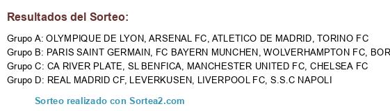 Lista de participantes: BORUSSIA DORTMUND, WOLVERHAMPTON FC, REAL MADRID CF, OLYMPIQUE DE LYON, ARSENAL FC, SL BENFICA, MANCHESTER UNITED FC, CHELSEA FC, PARIS SAINT GERMAIN, FC BAYERN MUNCHEN, TORINO FC, LIVERPOOL FC, CA RIVER PLATE, S.S.C NAPOLI, LEVERKUSEN, ATLETICO DE MADRID.