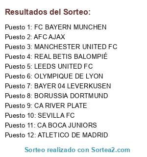 Lista de participantes: CA BOCA JUNIORS, BORUSSIA DORTMUND, ATLETICO DE MADRID, MANCHESTER UNITED FC, BAYER 04 LEVERKUSEN, FC BAYERN MUNCHEN, AFC AJAX, REAL BETIS BALOMPIÉ, OLYMPIQUE DE LYON, CA RIVER PLATE, LEEDS UNITED FC, SEVILLA FC.
