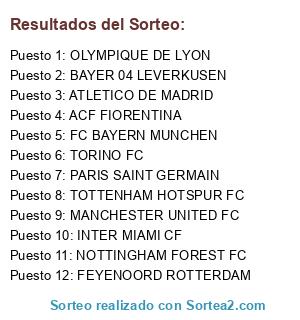 Lista de participantes: ATLETICO DE MADRID, TOTTENHAM HOTSPUR FC, FC BAYERN MUNCHEN, TORINO FC, INTER MIAMI CF, PARIS SAINT GERMAIN, MANCHESTER UNITED FC, OLYMPIQUE DE LYON, BAYER 04 LEVERKUSEN, ACF FIORENTINA, FEYENOORD ROTTERDAM, NOTTINGHAM FOREST FC.