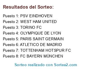 Lista de participantes: PARIS SAINT GERMAIN, TOTTENHAM HOTSPUR FC, ATLETICO DE MADRID, PSV EINDHOVEN, FC BAYERN MÜNCHEN, TORINO FC, OLYMPIQUE DE LYON, WEST HAM UNITED.