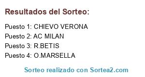 Lista de participantes: AC MILAN, R.BETIS, O.MARSELLA, CHIEVO VERONA.