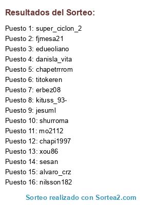 Lista de participantes: xou86, super_ciclon_2, nilsson182, erbez08, fjmesa21, titokeren, mo2112, danisla_vita, chapetrrrom, shurroma, jesuml, kituss_93-, alvaro_crz, sesan, chapi1997, edueoliano.