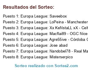 Lista de participantes: Europa League: Jose abad, Europa League: Macflai89 - OGC Nice, Europa League: LoPeina - Manchester City, Europa League: Misterserpico, Europa League: Agre55ive - Córdoba CF, Europa League: Nandobel78 - Real Madrid, Europa League: Xx KeNstaLL xX - Celta de Vigo, Europa League: Saveebox.
