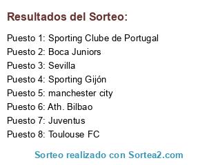 Lista de participantes: Boca Juniors, Juventus, manchester city, Ath. Bilbao, Sporting Gijón, Toulouse FC, Sporting Clube de Portugal, Sevilla.