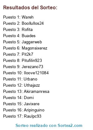 Lista de participantes: Domi, Raulpc93, Jerezano73, Magonsixerez, Aripinguino, Akiramanresa, Iloove121084, Pit2k7, Jaggerweb, Rofita, Urbano, Javixere, Boollullos24, Buades, Pitufilin923, Uthajazz, Wareh.