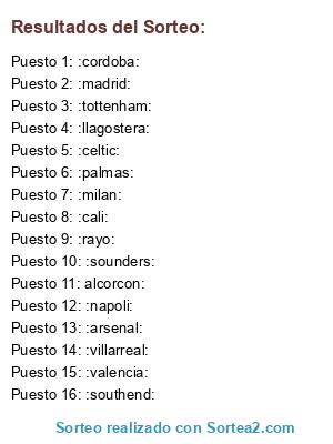Lista de participantes: :valencia:, :sounders:, :madrid:, :milan:, :celtic:, :cali:, :llagostera:, :villarreal:, :tottenham:, :rayo:, :napoli:, :southend:, :palmas:, alcorcon:, :cordoba:, :arsenal:.