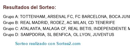 Lista de participantes: MALAGA CF, ARSENAL FC, RODEZ, JUVENTUS, SAMPDORIA, REAL BETIS, SL BENFICA, BOCA JUNIORS, CD TENERIFE, INDEPENDIENTE MEDELLIN, TOTTENHAM, REAL MADRID, OL.LYON, FC BARCELONA, ATALANTA, AC MILAN.