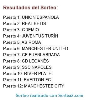 Lista de participantes: RIVER PLATE, EVERTON FC, CF FUENLABRADA, CD LEGANÉS, GREMIO, REAL BETIS, UNIÓN ESPAÑOLA, MANCHESTER UNITED, SSC NAPOLES, AS ROMA, JUVENTUS TURÍN, MANCHESTEE CITY.