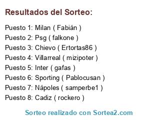 Lista de participantes: Psg ( falkone ), Inter ( gafas ), Sporting ( Pablocusan ), Villarreal ( mizipoter ), Cadiz ( rockero ), Nápoles ( samperbe1 ), Milan ( Fabián ), Chievo ( Ertortas86 ).