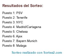 Lista de participantes: Madrid/Cartagena, PSV, Bayern Munich, Malaga, NYC, Ajax, Tenerife, Chelsea.