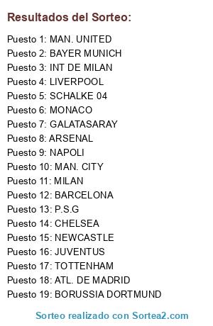 Lista de participantes: ARSENAL, ATL. DE MADRID, BARCELONA, BAYER MUNICH, BORUSSIA DORTMUND, CHELSEA, GALATASARAY, INT DE MILAN, JUVENTUS, LIVERPOOL, MAN. CITY, MAN. UNITED, MILAN, MONACO, NAPOLI, NEWCASTLE, P.S.G, TOTTENHAM, SCHALKE 04.