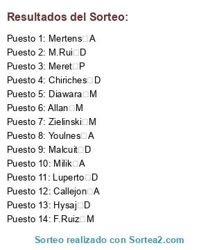 Lista de participantes: Allan M, Callejon A, Chiriches D, Diawara M, F.Ruiz M, Hysaj D, Luperto D, M.Rui D, Malcuit D, Meret P, Mertens A, Milik A, Youlnes A, Zielinski M.