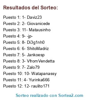 Lista de participantes: 1- Daviz23, 2- Giovanicede, 3- VfromVendetta, 4- Yurinka666, 5- Jankoesp, 6- ShitoMadriz, 7- Zalo79, 8- Di3g1nh0, 9- -jp-, 10- Watapanassy, 11- Matausinho, 12- raulito171.