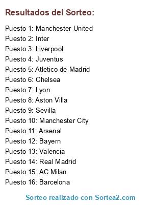 Lista de participantes: Barcelona, Real Madrid, AC Milan, Lyon, Manchester United, Arsenal, Liverpool, Bayern, Chelsea, Manchester City, Sevilla, Valencia, Atletico de Madrid, Inter, Aston Villa, Juventus.