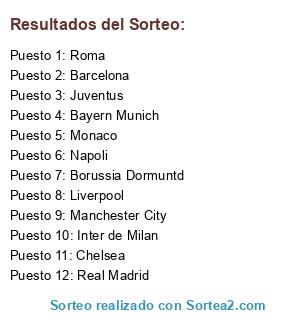Lista de participantes: Barcelona, Real Madrid, Bayern Munich, Borussia Dormuntd, Chelsea, Manchester City, Liverpool, Monaco, Napoli, Inter de Milan, Juventus, Roma.
