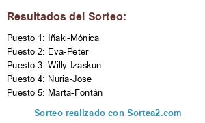 Lista de participantes: Eva-Peter, Iñaki-Mónica, Marta-Fontán, Nuria-Jose, Willy-Izaskun.
