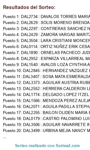 Lista de participantes: DAL0028 ORTEGA PEREZ DOMINGO, DAL0152 RAMIREZ TELLO MUÑOZ JOSE HILMAR, DAL0343 VALADEZ TORIBIO ALFREDO, DAL0364 HERNANDEZ CERVANTES ERIKA BERENICE, DAL0428 DIAZ MUNGUIA RAQUEL, DAL0452 REYNOSO RUIZ ALMA DELIA, DAL0626 ORTIZ NERY LILIA I, DAL0921 JIMENEZ VILLALOBOS LUZ MARIA, DAL1005 TOLENTINO QUEZADA CLAUDIA NAYELI, DAL1127 DIAZ GAMEZ JUAN FRANCISCO, DAL1275 CASTRO PALOMINO OSCAR, DAL1412 CANTERO LOPEZ CARLA JANETT, DAL1416 ALCALA GONZALEZ JAIME SALVADOR, DAL1540 AVALOS LOZA CYNTHIA ALELHI, DAL1548 GONZALEZ MATA LUISA IVETTE, DAL1566 MENDOZA PEREZ ALEJANDRA GUADALUPE, DAL1618 RODRIGUEZ HUERTA MARISELA, DAL1644 GUTIERREZ CORREA ALINA, DAL1890 ORNELAS PACHECO JUDITH GUADALUPE, DAL1962 MONTES CHAVEZ BANESA, DAL1968 GUERRA BELTRAN BEATRIZ ADRIANA, DAL1994 RAMIREZ CORTES CARLO JOSUE, DAL2069 HERNANDEZ RIVERA ALDAIR AARON, DAL2071 AGUILA PADILLA STEPHANIA GUADALUPE, DAL2102 ACOSTA RENTERIA JOSE LUIS, DAL2143 CARDENAS JIMENEZ LUIS MANUEL, DAL2184 LARA FERNANDEZ MARIA DEL SOCORRO, DAL2234 VAZQUEZ RUIZ JOEL ANTONIO, DAL2237 LOPEZ VILLANUEVA GLORIA ISABEL, DAL2255 BAILON OLIDEN MARIA ELISA, DAL2274 GUZMAN VARGAS DAVID, DAL2297 CONTRERAS SANCHEZ NANCY LIZBETH, DAL2313 MOLINA SANCHEZ MONSERRAT DEL CARMEN, DAL2316 DE LA CRUZ TARAZON ZULMA ELIZABETH, DAL2333 SANCHEZ MARTINEZ MARIA JOSE, DAL2406 REGALADO SORIANO YOKO ELIZABETH, DAL2429 ZAMORA VARGAS MARITZA ANDREA, DAL2523 PERALES MELENDEZ ANALUISA, DAL2543 FLORES ELIAS JOSE DE JESUS, DAL2563 GARCIA DE SANTOS MARIA GUADALUPE DE JESUS, DAL2593 CHAVEZ TOVAR LIDIA JUDITH, DAL2628 CORTES RAMOS ANGELICA YAZMIN, DAL2671 OTERO ZAVALA GABRIELA JENIFER, DAL2685 VEGA CAMARENA DAVID, DAL2696 MARTINEZ PAJAR CARLOS ANTONIO, DAL2705 RUIZ ROMERO ALEJANDRA, DAL2710 QUIROZ QUIROZ LUIS DAVID, DAL2725 MARTIN DEL REAL FATIMA GUADALUPE, DAL2734 DAVALOS TORRES MARIA DE LOS ANGELES, DAL2764 CAMACHO CURIEL MARTHA, DAL2834 SANCHEZ HERNANDEZ JOSUE CARLOS, DAL2836 RAMIREZ RAMIREZ ANA KARINA, DAL2846 MARTINEZ MASCORRO JORGE ESTEBAN, DAL2884 ZEPEDA MACIAS PRISCILLA GUADALUPE, DAL2930 RODRIGUEZ GARCIA AMPARO, DAL2952 ESPARZA VILLARREAL MARIA, DAL2974 PARTIDA GARCIA MARIA ALEJANDRA, DAL2976 HERNANDEZ LOMELI HECTOR ANDRES, DAL2997 CANAL RAMIREZ TOMASA CARINA, DAL3003 DIAZ AGUAYO GINA IVETTE, DAL3008 LANDEROS RAMIREZ JOCELYN VANESSA, DAL3015 LIRA GARCIA CRISTINA DE JESUS, DAL3074 NUÑO SALAZAR VALERIA, DAL3075 PEREZ X KAREN MARGARITA, DAL3092 MEJIA OROZCO CRISTHIAN DE JESUS, DAL3104 VARGAS OSORIO ORLANDO, DAL3115 HERNANDEZ DIAZ ALMA CECILIA, DAL3123 SERNA LOPEZ ARNOLDO, DAL3125 MARQUEZ CASTILLO JUANA BERENICE, DAL3126 HERNANDEZ ARANDA YOMAYRA ELIZABETH, DAL3136 GARCIA PADILLA JUAN ANTONIO, DAL3162 OROZCO ALDRETE OLIVIA, DAL3172 HERNANDEZ QUIRARTE SERGIO, DAL3175 RAMIREZ GOMEZ JESSICA, DAL3176 COLLAZO RIVERA KARLA LIZETTE, DAL3194 CAMACHO BARAJAS GABRIELA, DAL3224 GUTIERREZ SALAZAR OMAR, DAL3244 ALFARO MARROQUIN EVA PILAR, DAL3267 ROSALES PEREZ MARIA DEL ROCIO, DAL3318 VELEZ VIRGEN ELIA GABRIELA, DAL3320 CONDE CELAYA ELIZABETH, DAL3383 CERVANTES CERECERES LAURA MAGALY, DAL3392 FLORES GOMEZ CRISTIAN JAVIER, DAL3398 MONRREAL GALLEGOS ENRIQUE, DAL3421 ROMERO CASTRO NORMA ALICIA, DAL3422 BOZADA SANTOS LEONOR, DAL3468 CUELLAR REYNA ALMA ISABEL, DAL3472 RABAGO DE LA ROSA LILIANA MARIA, DAL3477 DE LA CRUZ HERNANDEZ SAMUEL, DAL3478 CRUZ VALDERRABANO ESMERALDA, DAL3486 TRUJILLO MOTA JOSE LUIS, DAL3495 ISAAC JIMENEZ IRMA LETICIA, DAL3496 ROSALES AVILA KARLA MARIA, DAL3497 RAMIREZ SALAS ISIDRO, DAL3501 FLORES GUTIERREZ CARMEN PAULINA, DAL3505 PADILLA ESPARZA VIVIANA JANETH, DAL3508 SANDOVAL SANCHEZ ALEJANDRO, SER0039 GONZALEZ ROCHA FRANCISCO JOSE, DAL0111 GARCIA DE LLANO VALENZUELA CESAR ARCADIO, DAL2338 VILLEGAS HERNANDEZ CARLOS ALBERTO, DAL2572 PARDO HUERTA JOSE ANGEL, DAL2765 TORRES HERNANDEZ ESMERALDA JANET, DAL3086 HERRADA MARISCAL ANGEL DANIEL, DAL3479 GUEVARA TABAREZ NATALIA ELIZABETH, DAL3489 GONZALEZ IBARRA JONATHAN ADAN, DAL3498 RODRIGUEZ CRUZ ROBERTO CARLOS, DAL3507 ESTRADA GUERRERO FELIX OMAR, DAL0077 RODRIGUEZ MAGDALENO SALVADOR, DAL0179 CASTRO PALOMINO LUIS ARTURO, DAL0376 HERRADA MARISCAL IVAN DAVID, DAL0543 BARAJAS GUDIÑO DIEGO RODRIGO, DAL0761 NAVA ORTEGA CESAR ARMANDO, DAL0886 TRUJILLO MOTA CARLOS NICANOR, DAL1017 RAMIREZ NAVARRO SANDRO MISAEL, DAL1020 TORRES FLORES VICTOR ALEJANDRO, DAL1414 MARQUEZ CAZARES ERIC GAMALIEL, DAL1436 ESTRADA SANTIAGO ALEJANDRO, DAL1500 VALADEZ VALDOVINOS VICTOR HUGO, DAL1681 DIAZ AGUIRRE GIBRAN NOEL, DAL1914 RAMIREZ GUZMAN MARIA CRISTINA, DAL1964 AMEZCUA CENTENO JOSE FRANCISCO, DAL2188 MONTAÑO PEREZ JORGE ALBERTO, DAL2279 GRAJEDA ORTIZ PAOLA MICHELLE, DAL2421 MARTINEZ RODRIGUEZ ANDREA ADRIANA, DAL2823 RODRIGUEZ VENTURA MARIA CONCEPCION, DAL2845 HERNANDEZ VAZQUEZ LUCIA BERENICE, DAL3076 MORALES CORDOVA BLANCA MELINA, DAL3313 SUAREZ AVILES ANA LOURDES, DAL0790 AGUILAR MARQUEZ NAYELI, DAL1304 SANCHEZ TRUJILLO GABRIELA, DAL1309 FONSECA RODRIGUEZ OSCAR EDMUNDO, DAL1624 GARCIA JIMENEZ ALBA, DAL1774 DELGADO LOPEZ ITZEL, DAL2331 CONTRERAS MACIAS HARUI YOHUALLI, DAL2552 HERRERA CALDERON LIZVETT SILVIA, DAL2629 SOLIS MORENO BRENDA BERENICE, DAL2701 HERNANDEZ CEDILLO ALICIA MASSIEL, DAL2805 GUZMAN PEREZ LIZETH ANGELICA, DAL2810 TREJO REYES JOSE DE JESUS, DAL2964 VELAZQUEZ VAZQUEZ JUAN PABLO, DAL3017 MARTINEZ MARTINEZ JOSE ANTONIO, DAL3019 MONTOYA FRANCO YESUA, DAL3057 ROJAS FLORES VERONICA, DAL3287 GOMEZ REYES IVONNE, DAL3290 MARTINEZ CHAVEZ CARLA KARINA, DAL3295 HUERTA RIOS SALVADOR, DAL3312 MENDEZ TORRES DANIELA, DAL3373 AGUILAR AUSTRIA RUBEN, DAL3376 SEGURA HERNANDEZ DULCE SOCORRO, DAL3396 MEZA LOPEZ SERGIO FABIAN, DAL3407 SOSA MATA ESMERALDA BERENICE, DAL3439 RIOS OLMEDO EDUARDO, DAL3473 SERVIN MONTOYA MARIANA FERNANDA, DAL3480 ZARATE BENITEZ ANA CRISTINA, DAL3488 GARAY CABALLERO DULCE SAHRAY, DAL3490 LOPEZ REYES VARELA MARIA FERNANDA, DAL3491 BETANCOURT HERNANDEZ CLAUDIA BERENICE, DAL3492 BATRES FRANCO ALBERTO, DAL3493 CERVANTES DE LA CRUZ ALDO ALEJANDRO, DAL3499 URBINA MEJIA NANCY MAGALY, DAL3500 PEDRAZA ROMERO LIZBET, DAL3502 