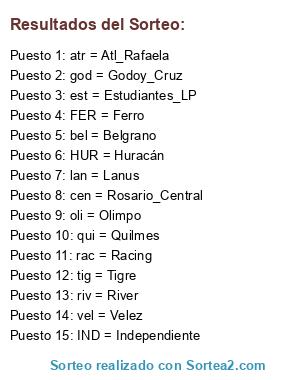Lista de participantes: atr = Atl_Rafaela, bel = Belgrano, est = Estudiantes_LP, god = Godoy_Cruz, lan = Lanus, oli = Olimpo, qui = Quilmes, rac = Racing, riv = River, cen = Rosario_Central, tig = Tigre, vel = Velez, HUR = Huracán, IND = Independiente, FER = Ferro.