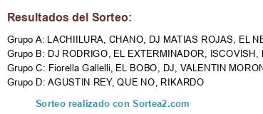 Lista de participantes: CHANO, VALENTIN MORON, Fiorella Gallelli, AGUSTIN REY, EL BOBO, DJ, DJ MATIAS ROJAS, ISCOVISH, DJ RODRIGO, QUE NO, LACHIILURA, EL EXTERMINADOR, MATIAS, EL NEGRO, RIKARDO.