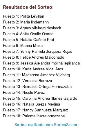 Lista de participantes: Paloma ibarra ormazabal, Jessica Alejandra molina lepillanca, Maria lindemann, Felipe Andres Maldonado, Agnes vlieberg desbeck, Nicole Pavez, Veronica Barraza, Karla Andrea Vidal Aros, Nancy Sanhueza Marquez, Macarena Jimenez Vlieberg, Marina Meza, Polita Levillan, Reinaldo Ortega Hormazabal, Natalia Baeza Medina, Natalia Cañete Prat, Carolina Andrea Illanes Gajardo, Yenny Pamela Jorquera Rojas, Anita Ovalle Osorio.
