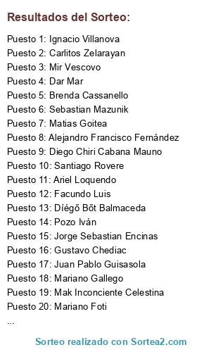 Lista de participantes: Krastu Krastu, Emanuel E. Muiño, Lucas Quiroga, Charly DC, Hola Soy Cesar, Blog personal, Dario Bntz, Stella Rojas, Rigo Cba, Nick Vargas, Nicolás Mazzarello, Vero Carp, Axel Pablo Angio, Liliana Piccinetti, Santiago Cejas, Mary Di Prinzio, Makioka Nagito, Agustin Ferrario, Favio Bautizzta, Marcelo Timpanaro, Mariano Gallego, Ezequiel Molina, Javier Distefano, Emanuel M, Gonzalo Gallo, Fer Quintana, Gabriel Bravo, Demian Verdinelli, Ignacio Villanova, Eduardo Gonzalez Villa, Lucas Diaz, Nahuel Luna, Lore Robles, Maxi Moyano, Joaquin Hoffman, Kazutaka Muraki, Marian Catalan, Gonzalo Quesada, Dar Mar, Silvina Salamendi, Adrian Diaz, Brenda Cassanello, Mario Quilian, Jean Lavarello, Marcos Bossio, Alejandro Francisco Fernández, Alan Montes de Oca, Franco Rulos, Ariel Schmunck, Blanca Gonzalez, Mir Vescovo, Marcos Jabase, Marco Bianco, Mariano Foti, Ideambhorg De Hugdri, Mak Inconciente Celestina, Vane DeCenturion, Juan Manuel Martinez, Fernando Correas, Fabricio Páez, Emanuel Wecker, Ariel Fernández, Diego Chiri Cabana Mauno, Gaston Domingo, Manu Messina, Matias Nahuel Rojas, Diego Ganzo Blutmann, Sebastian André, Hector Barrionuevo, Agustin Greco, Heber Del San Luis, Ariel Loquendo, Díégő Bőt Balmaceda, Diego Ferradans, Rodrigo DC, Jorgelina Lucia Coria, Cesar Angel Benitez, Ariel Carrizo, David Del Valle, Gaston Taborda, Alejandro del Rio, Berial Sama, Diego Alberto Chosco, Dimitrij Arg, Axelithóó De Vc, Nicolas Espeche, Federico Giacomantone, Jorge Sebastian Encinas, Diego Eduardo, Guille Darkk, Mardk Marce, Martin Clemente, Maximiliano Polimeni, Sebastian Mazunik, Ezequiel Pereyra, Gaston Chiavazza, Laya Ruben, Matias Zeni, Mauri Cabrera, Pochyy Ta, , Marcelo Rafael, Juanjo Rivero Lobos, Federico Navarro, Gustavo Chediac, Fernando Viozzi, AnVer Onica, Nacho Somoza, Carlos Córdova, Lucas Venesia, Javier Milgrave, Patricia Alejandra Peralta, Lucho Canalla Stanka, Antonia Andrade, Mariano Seen, Joaquin Wojcik, Carlos Gallas, Carlos Alfredo Vaianella, Karina Edit, Adrián Saavedra, Pablo Araujo, Gabriel Moyano, Brenda Orquin, Juan Pablo Guisasola, Nicolas Akenaton, Ramon Renguero Orsolini, Lean Regue, Facundo Luis, Nahuel Puig, Juan Pablo Valverde, Iglesia Lucas, Noelia Novillo, Germanet Knet, Exequiel Lugo, Kevin Lopez, Sebastian Riccardo, Israel Subassi, Yoel Marcovich, Walter Alejandro Diaz, Leonardo Martin Castaño Di Prinzio, Eduh Dalcin, Gaston Luna, Tomás Iván Acosta, Andy Martín Oertel, Juan Manuel, Jona Muiño, Angelica Rios, Agustin Toledo, Christian Flores, Gino Pidone, Cesar Aguirre, Leandro Medina, Gabriel Barrera, Gonzalo Chaves del Pino, Agustin Post Mortem, Fran Marchetti, Ricardo Gabriel Ayles, Juan Cruz Zarate, Ana Paula Magheri, Lucas Tomas, Santiago Rovere, Ramiro Bornissen, Jorge Santillán, Walter Peñalva, Rosaura Esther Albanese, Nico Abatedaga, Lucas Ariel Millán, Matias Ezequiel, Nicolas Merlino, Fernando Antúnez, Lucas Rios, Pozo Iván, Carlitos Zelarayan, Damian Facchini, Diego Rojas, Patricio Saleski, Eugenio Babini, Diego Leonardo Calenta, Santy Gonzalez, Ezequiel Gomez, Benja Plaza, Juan Tribbia, Santiago Riera, Santiago Cuello, Pino Alem, Maria Gonzalez, Agus Tin, Matias Goitea, Neron De Merthiolate, Eloy Vega, Alejandro Exequiel, Ramiro Calvo, Julian Ignacio, Santiago Bru, Ariel Lyardet, Alejandra Naccarato, Manu Araya, Nicolas Ramallo, Ezequiel Rodrigo, Chunko Aguilera, Gonzha Cbt, Facundo Gabriel Dignani, Juan Manuel Barrenechea, Sol Kuczala, Agustin Masini, Agustin Baricalla, Francisco Cerdera, Choli Acosta, Michael Armando Aruquipa Plata, Julieta Laura Crespi, Ramiro Planes, Tadeo Arditti, Carlos Galicia, Daniel Krumecadyk, Omar Benitez, Nicolas Franco Cornejo, Vero de Alarcia, Francisco Pein, Dario Ferreyra, Andy Villarruel, Esteban Sampayo, Damian Jatom, Rodrigo Esteban Allegrucci Kowalczyk, Matex, David Moreno, Gabriel Emanuel Valenzuela, Gonzalo Ramos, Kevin Moll, Emma Giannattasio, Lizi R. Porthé, Juan Manuel Campos, Tomas Muñoz.