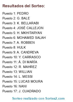 Lista de participantes: L. MESSI, G. BALE, A. ROBBEN, Á. DI MARÍA, WILLIAN, JOSÉ CALLEJON, H. MKHITARYAN, MOHAMED SALAH, HULK, A. CANDREVA, K. BELLARABI, NANI, PEDRO, J. CUADRADO, LUCAS MOURA, Y. CARRASCO, R. MAHREZ.