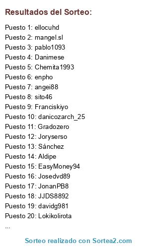 Lista de participantes: Aldipe, Adri_casti90, Josedvd89, ai-man-lol, enpho, Joryserso, pablo1093, Danimese, Quiron888, Gons10, francisb04, fornides, apaez91, wazo, referee_21, pedroeloy95, danicozarch_25, mangel.sl, EduCM, Chemita1993, Orbi11, leticoes, JJDS8892, angei88, sito46, davidg981, alexmar_93, ellocuhd, JonanPB8, Uve_mula, sanmiguel25, Franciskiyo, EasyMoney94, Lokikolirota, pombokiller, jaimegx_94, Gradozero, Sánchez, Alberto9.