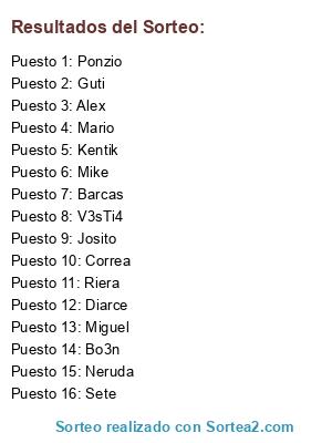 Lista de participantes: Alex, Barcas, Bo3n, Correa, Diarce, Guti, Josito, Kentik, Mario, Mike, Miguel, Neruda, Ponzio, Riera, Sete, V3sTi4.