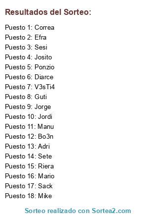 Lista de participantes: Guti, Jorge, Efra, Jonsi, Josito, Sete, Sack, Diego, Diarce, Correa, Boen, Mario, Adri, Riera, Mike, v3sTi4, Jordi, Sesi.