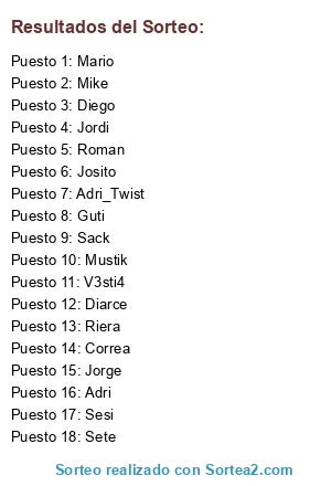 Lista de participantes: Jorge, Adri_Twist, Adri, Jordi, Diarce, Mike, Riera, Roman, Mario, Mustik, Diego, Sesi, Josito, Guti, Sack, Correa, Sete, V3sti4.