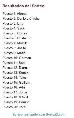 Lista de participantes: Kentik, Diarce, Adri, Mario, Abundi, Jordi, Mustik, v3sTi4, Correa, Guti, Sesi, Josito, Jorge, Ponzio, Efra, Riera.