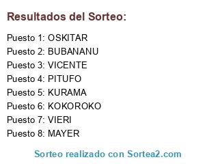 Lista de participantes: BUBANANU, KURAMA, MAYER, VIERI, VICENTE, OSKITAR, PITUFO, KOKOROKO.