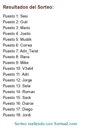 Lista de participantes: Jorge, Adri_Twist, Adri, Jordi, Diarce, Mike, Riera, Roman, Mario, Mustik, Diego, Sesi, Josito, Guti, Sack, Correa, Sete, V3sti4.