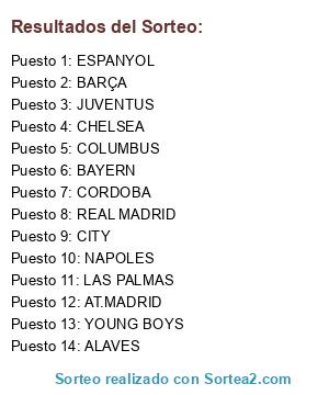 Lista de participantes: AT.MADRID, BAYERN, YOUNG BOYS, CHELSEA, COLUMBUS, CORDOBA, ALAVES, BARÇA, JUVENTUS, CITY, NAPOLES, ESPANYOL, REAL MADRID, LAS PALMAS.