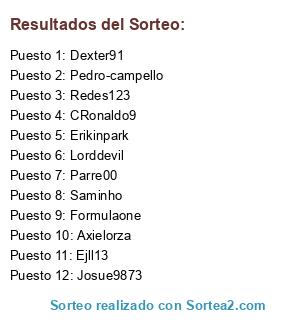 Lista de participantes: Erikinpark, Ejll13, Pedro-campello, Josue9873, Formulaone, Redes123, CRonaldo9, Saminho, Lorddevil, Dexter91, Parre00, Axielorza.