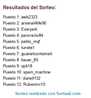 Lista de participantes: spain_machine, danell132, pablo_mqf, arsenal4life90, guanaticontomati, opk18, awb2323, Rubenmc10, pancracio84, Everyark, bauer_85, tunete1.