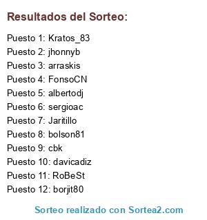 Lista de participantes: Jaritillo, borjit80, bolson81, arraskis, albertodj, cbk, davicadiz, jhonnyb, sergioac, Kratos_83, FonsoCN, RoBeSt.
