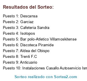 Lista de participantes: Trenti F.C, Bar polo-Atletico Villamoskitense, Discoteca Piramide, Aldea del Obispo, Garciaz, Instalaciones Casallo Autoservicio Ismael, Cafeteria Sandra, Anticuario, Isotopos, Descansa.
