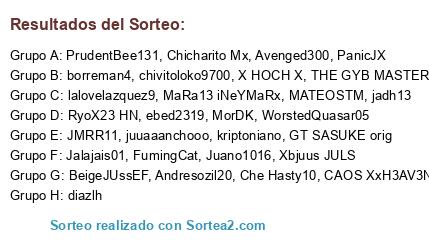 Lista de participantes: Juano1016, MATEOSTM, lalovelazquez9, PrudentBee131, ebed2319, GT SASUKE orig, WorstedQuasar05, CAOS XxH3AV3NxX, PanicJX, MorDK, RyoX23 HN, Avenged300, THE GYB MASTER, Jalajais01, Chicharito Mx, juuaaanchooo, Xbjuus JULS, chivitoloko9700, diazlh, borreman4, kriptoniano, Andresozil20, JMRR11, FumingCat, jadh13, Che Hasty10, X HOCH X, BeigeJUssEF, MaRa13 iNeYMaRx.