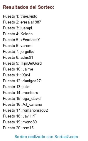 Lista de participantes: romanomad82, xFearlessY, thee.kiidd, rcm15, Kolorin, ega_david, JaviHrT, adris91, jorgetkd, varomt, erreala1987, julio, HijoDelGordi, juampi, danigea27, Jaime, Xavi, AJ_canario, mono80, monto rs.