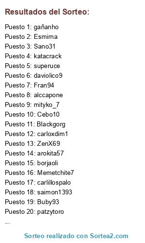 Lista de participantes: ZenX69, saimon1393, borjaoli, Memetchite7, Fran94, Maikel, Esmirna, carlillospalo, chavahacker, patzytoro, carloxdim1, daviolico9, danieliyo, gañanho, alccapone, arokita57, katacrack, Buby93, VaronDandi, mityko_7, superuce, Cebo10, Sano31, Blackgorg.