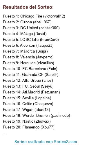 Lista de participantes: Girona (abel_967), Flamengo (Xou77), Everton (11_Jose_11), DC United (cesitar360), Wigan (abad13), FC Barcelona (Fale), Celtic (Chequevo), Alcoyano (Truppy), Werder Bremen (paulinodp), LOSC Lille (FranCer0), Hercules (elvarillas), Granada CF (Saip3r), Alcorcon (Taupo23), Chicago Fire (victorvall12), Ath. Bilbao (Litos), FC. Seoul (Seryu), Valencia (Jayperro), Atl.Madrid (Pezuman), Mallorca (Borja), Incheon United (Lausseq), Nastic (Zholvax), Málaga (David), Wolves (Ojeda), Sevilla (Lopeina).
