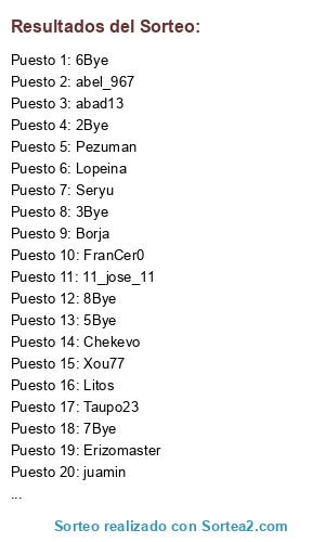 Lista de participantes: Oskar, Pezuman, Erizomaster, Seryu, Litos, Lausseq, David, Borja, Zholvax, Boti, Danzare, Lopeina, Jayperro, Ojeda, victorvall12, FranCer0, abad13, abel_967, Xou77, cesitar360, 11_jose_11, juamin, Fale, Truppy, juliangarcia, Chekevo, Taupo23, elvarillas, 1Bye, 2Bye, 3Bye, 4Bye, 5Bye, 6Bye, 7Bye, 8Bye.
