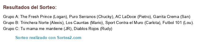 Lista de participantes: Trinchera Norte (Alexis), Los Cauntas (Mario), Sport Contra el Muro (Carlota), Tu mama me mantiene (JR), Diablos Rojos (Rudy), The Fresh Prince (Logan), AC LaDoce (Pietro), Puro Serranos (Chucky), Garrita Crema (San), Futbol 101 (Lou)..