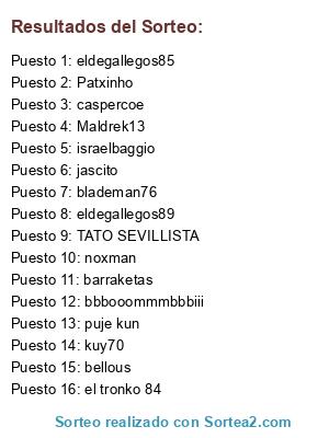 Lista de participantes: barraketas, bbbooommmbbbiii, bellous, blademan76, caspercoe, el tronko 84, eldegallegos85, eldegallegos89, israelbaggio, jascito, kuy70, Maldrek13, noxman, Patxinho, puje kun, TATO SEVILLISTA.