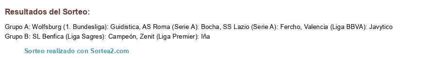 Lista de participantes: Valencia (Liga BBVA): Javytico, Zenit (Liga Premier): Iña, AS Roma (Serie A): Bocha, SL Benfica (Liga Sagres): Campeón, Wolfsburg (1. Bundesliga): Guidistica, SS Lazio (Serie A): Fercho.