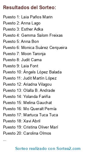 Lista de participantes: Mo Queralt Pernía(4 participaciones), Laia Paños Marin(2 participaciones), Esther Adka(3 participaciones), Anna Escudé Martin, Gemma Salom Freixas(3 participaciones), Ariadna Vilagou(4 participaciones), Yolanda Fariña(4 participaciones), Cristina Vega(3 participaciones), Olalla B. Andrade, Judit Martín López(4 participaciones), Moon Taronja(4 participaciones), Laia Font(3 participaciones), Monica Suàrez Cerqueira(4 participaciones), Àngels López Balada(3 participaciones), Nekane Marin, Martuca Tuca Tuca(2 participaciones), Eva Salat Ferrer(2 participaciones), Anna Lago(4 participaciones), Judit Cama(3 participaciones), Lluïsa Pont Gabarró(4 participaciones), Xavi Abril(4 participaciones), Carolina Olmos(4 participaciones), Melina Gauchat(3 participaciones), Cristina Oliver Marí(3 participaciones), Anna Bon(4 participaciones).