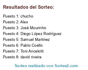 Lista de participantes: Alex, chucho, José Mourinho, david riveira, Pablo Coello, Samuel Martinez, Toni Ancelotti, Diego López Rodríguez.