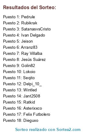 Lista de participantes: Rubikrak, Pedrule, SatanasvsCristo, Dieguxo, Ivan Delgado, Delpi_10_, Arranz83, Jant2508, Seqito, Asterixxco, Golin82, Jesús Suárez, Jeison, Lokoio, Ratkid, Wintled, Felix Futbolero, Ray Villalba.